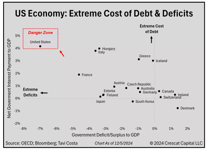The US now has Extreme Deficits and the highest interest rate costs across the globe.
