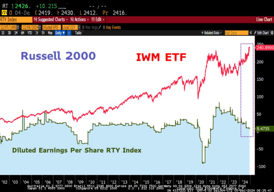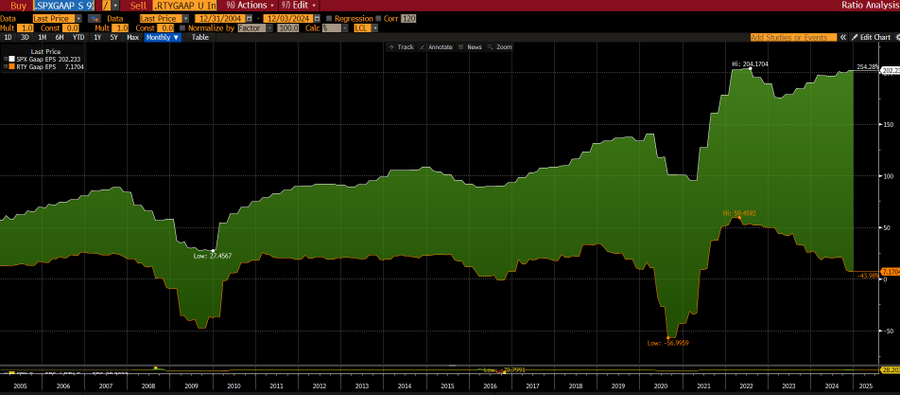 While the amount invested in leveraged Assets Under Management has exploded to new highs. GAAP earnings on the S&P 500 have been unchanged over the last 3 years. Meanwhile, GAAP earnings on the Russell 2000 have collapsed over the last 3 years by more than 80% to the middle of its 20-year range. Here is an explanation of GAAP.