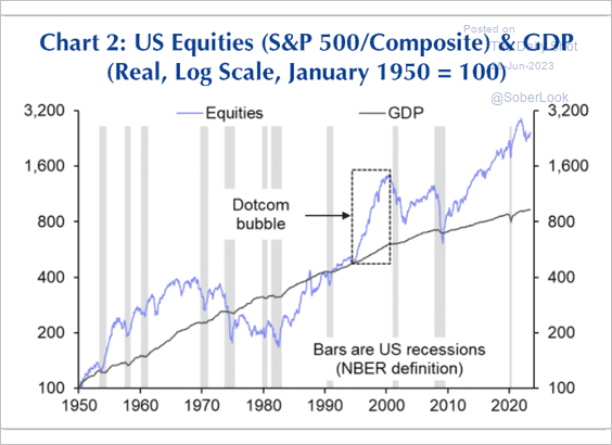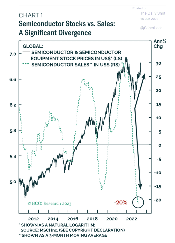 Nasdaq 100 index correlations with other assets have been disrupted by a surge in mega-cap technology stocks. There is an extraordinary divergence of Semiconductor sales from stock prices, and the