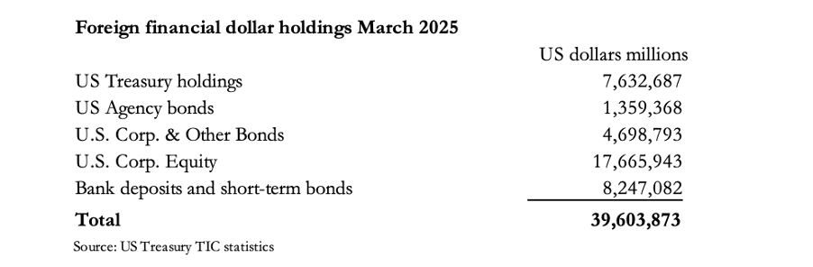 The US’s debt pile would not have grown this much if it wasn’t for the enduring belief that US Treasury debt is the most secure form of credit in the post-Bretton Woods currency system. The conviction that it would always be demanded even in a crisis has encouraged US government profligacy. Consequently, foreign ownership of US dollars and dollar-denominated assets has increased to staggering levels. The table below breaks down where this $39.6 trillion is allocated.