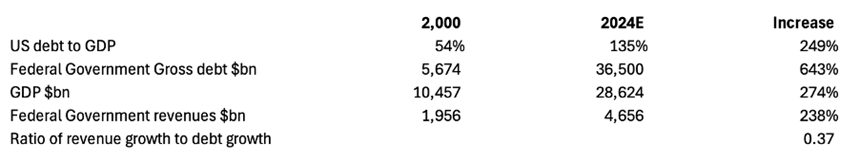 Here, we can see that gross debt is soaring at a far faster rate than GDP, and even more so measured in the Federal Government revenues which are behind the sustainability of the debt. With the increase of revenue only covering 37% of the debt increase, the US Treasury is in a classic debt trap; a fact which is increasingly recognised by foreign central bankers who are getting out of dollars and into gold.