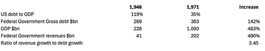 Much of the complacency over government debt levels arises from the fact that high WW2 debt levels were reduced over the following two decades to manageable levels, fuelling a belief that it can be done again. America’s government debt to GDP in 1946 peaked at 120%, below current peace-time levels, falling to 35% in 1971 when Nixon suspended the Bretton Woods Agreement. The relevant figures are shown in the table below.