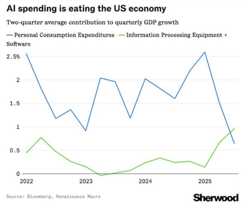 AI is eating the US economy. Together with excessive deficit spending this is where US “growth” is coming from. Leveraged spending not natural organic prosperous growth.