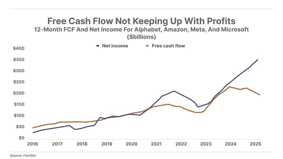 Up until the AI boom kicked off with the launch of ChatGPT in late 2022, big tech’s free cash flow generally tracked their earnings growth. But since 2023, these companies have been sinking earnings into capex for data centers and other AI infrastructure. As a result, free cash flows are falling even as reported earnings are rising. This sets up a key risk for tech stocks and the overall market if the AI capex boom doesn’t eventually lead to free cash flow growth.