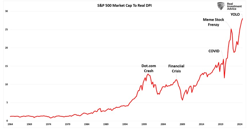 The S&P 500 has disconnected from real disposable income. It used to be that real disposable income drove the economy which drove the stock market. Economic policy has entirely broken and even reversed this natural causality since the dollar was unhinged from gold in 1970. This is the kind of malpractice that fiat money enables.