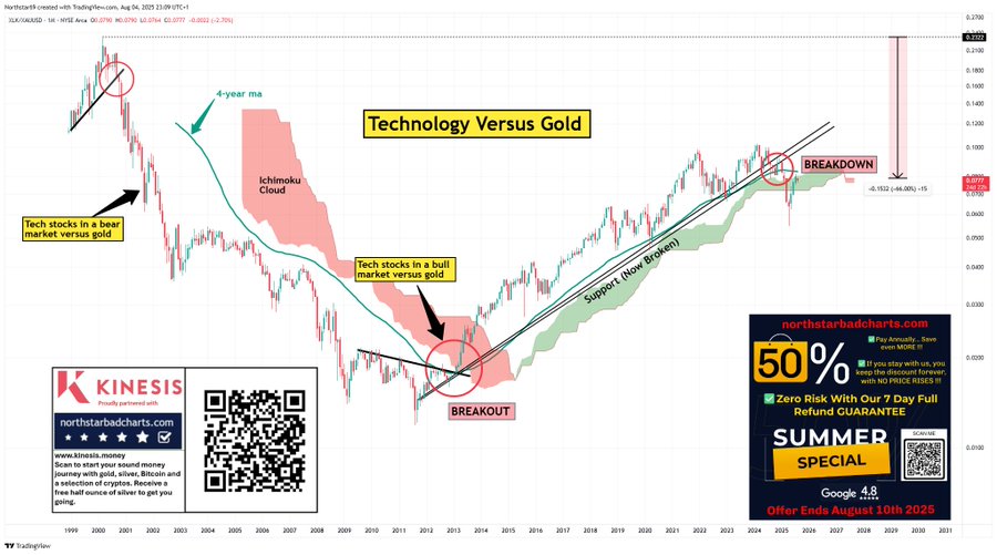 Tech – The biggest sector of the S&P 500…down 66% from the highs and breaking down into a new bear market versus gold. Once the market catches on it’s game over.