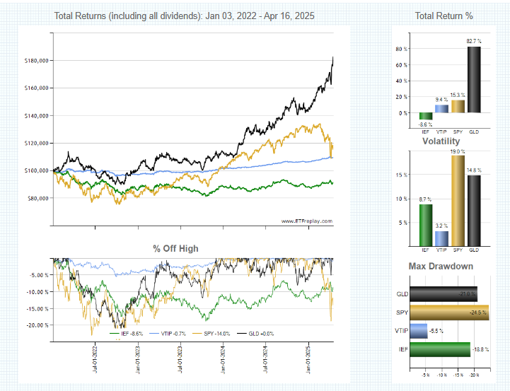 The outperformance of gold and TIPS has continued through to the present, for more than three years now. The S&P 500 has massively underperformed gold and barely outperformed VTIP. Bonds have remained in a bear market. The S&P 500 and bonds 60/40 portfolio are high risk losers compared to TIPS and gold.