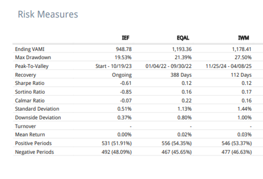 - The drawdowns and time to recover the prior peak. Although IEF (8 year Treasury Bonds) are still in drawdown as they have still not recovered.
