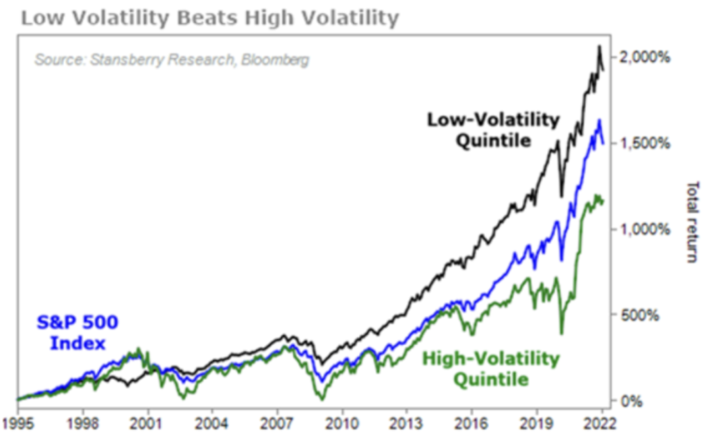Across multiple studies of the S&P 500, the stocks with the lowest volatility consistently outperformed the most volatile ones, even during a 27-year bull market.