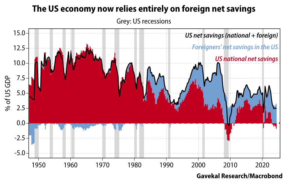 5. The US is now fully credit dependent. On a net basis the US has negative savings. Even foreigners are reducing their US dollar savings.