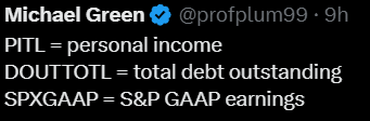 - Total debt has risen broadly in line with personal income, but with excessive government borrowing, and chronically weak private sector borrowing. Why is private sector borrowing so weak and the stock market so strong, other than the interpretation in this blog?