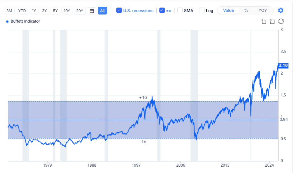The chart below shows the Buffett Indicator, which is the total U.S. market value divided by the GDP of America. The ratio range shown indicates the expected valuation; when the graph is below this range, the market is undervalued, and when it is above the range it is overvalued.