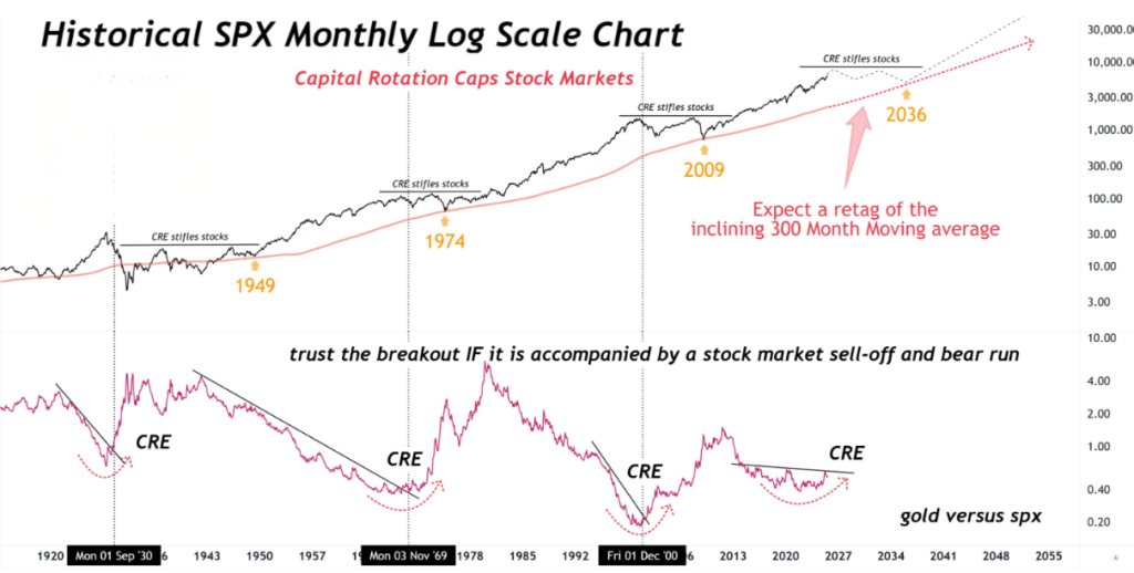 In the bottom graph, you can see the CREs more clearly, shown by the relationship between the price of gold and the S&P 500 (SPX). When the markets crash, it’s good to be in gold.