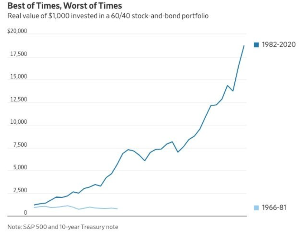 The last time the US experienced stagflation (1966 – 1981) the 60/40 stock/bond portfolio went sideways for 15 years, or down 50% in real terms!