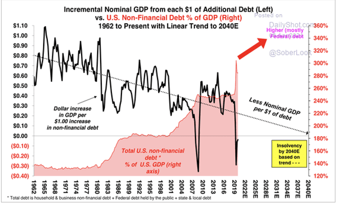 It is clear that over the last 5 decades, the more the debt % of GDP has risen the less impact debt growth has had on boosting GDP growth.