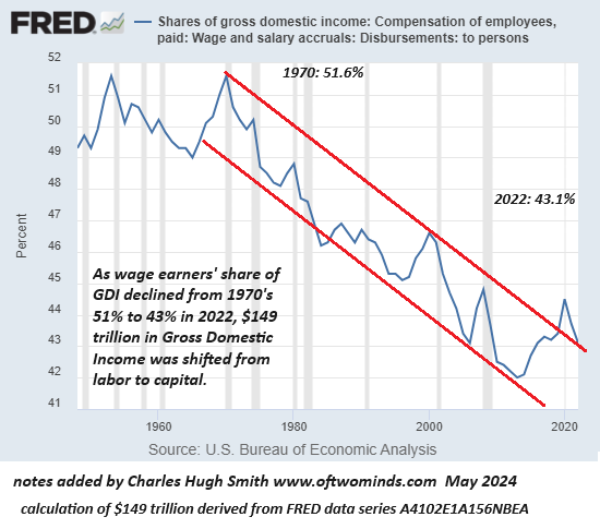 Inflation incentives evolve by increasing the scale of the credit cycle through bailouts. This encourages risk taking and even greater bailouts, as credit increasingly replaces capital. Real wages decline, leading to increasing wealth inequality.