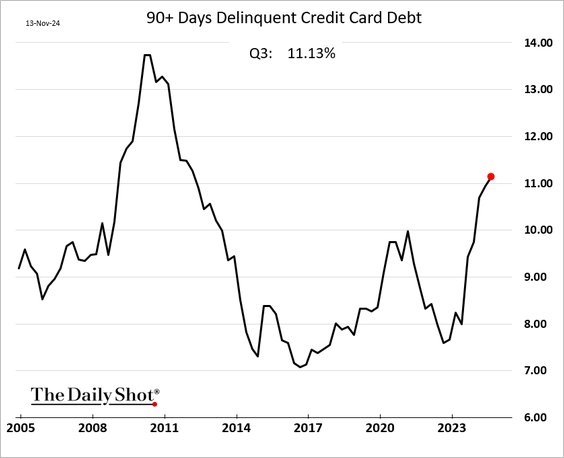 The percentage of US credit card debt that is delinquent reached its highest level in over a decade last quarter.