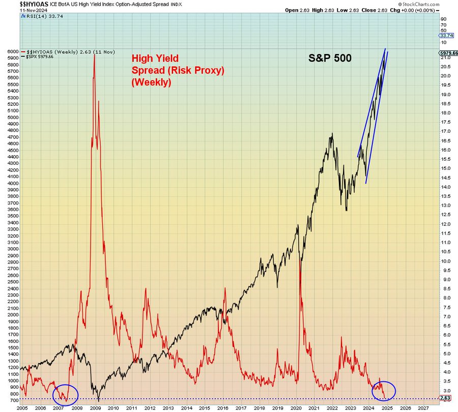 The S&P 500 is trying to go vertical at valuations never seen before. Just as junk bond spreads to government bonds have gone to the lowest historical extremes only seen just before the great financial crisis of 2008.