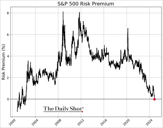 More simply from an income point of view… The S&P 500 risk premium (forward earnings yield minus the 10-year Treasury yield) has turned negative for the first time since 2002, indicating frothy valuations in the US stock market.